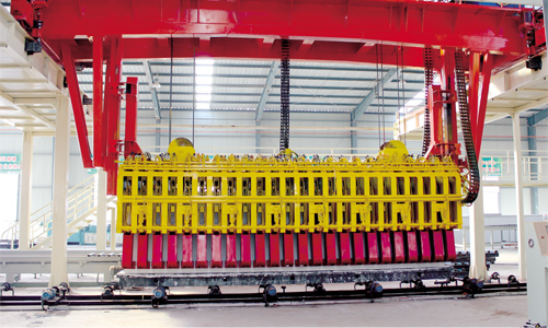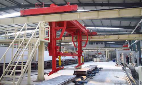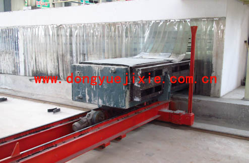 將預(yù)養(yǎng)完成的坯體(帶模具和模具側(cè)板)在空中翻轉(zhuǎn)90°,并放在蒸養(yǎng)小車上,翻轉(zhuǎn)吊具開鎖器將模具鎖臂開啟,坯體垂直放在側(cè)板上,由切割小車運(yùn)至切割區(qū)進(jìn)行切割。