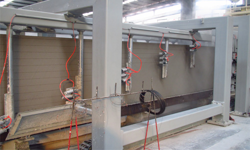 蒸養(yǎng)小車帶動坯體到切割區(qū),按照預(yù)先設(shè)定好的數(shù)據(jù)先進(jìn)行橫向切割,對于加氣板材坯體兩側(cè)先進(jìn)行銑槽處理;然后小車到縱向切割裝置下方,由液壓置換將側(cè)板連同坯體頂起,縱切架帶動鋼絲做鋸裝擺動進(jìn)行縱向切割。