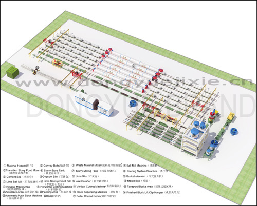 東岳機械股份有限公司是生產(chǎn)加氣混凝土設(shè)備,免燒磚機,加氣混凝土生產(chǎn)線等制品的廠家。集多年的混凝土制品機械制造經(jīng)驗,在廣泛吸收國內(nèi)外設(shè)備優(yōu)點的基礎(chǔ)上,經(jīng)技術(shù)革新,在多方面作以大量改進優(yōu)化,我公司設(shè)計的20萬立方加氣混凝土生產(chǎn)線,已達到國內(nèi)同類設(shè)備水平,所生產(chǎn)加氣混凝土砌塊抗壓強度可達到5.0-7.5級,收縮值小于0.8mm/m,其質(zhì)量高、重量輕、抗?jié)B性好、隔音、隔熱、保溫、抗震性能優(yōu)良,外形尺寸精確,其破損率低。下面是我公司生產(chǎn)的20萬立方加氣混凝土生產(chǎn)線生產(chǎn)流程及相關(guān)設(shè)備介紹。